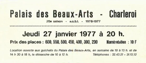 | 27.01.1977 | Charleroi | Palais des Beaux Arts | B | Ticket | C | |||