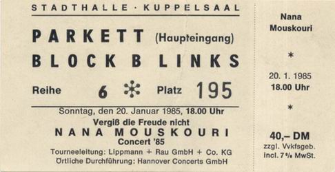 | 27.01.1985 | Frankfurt / Main | Jahrhunderthalle | D | Ticket | C | |||
