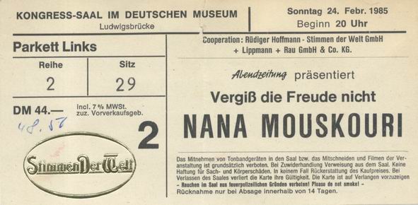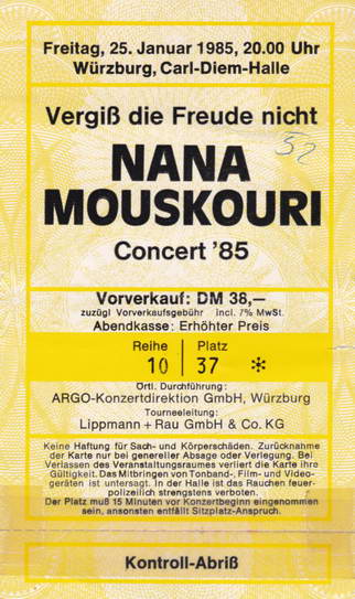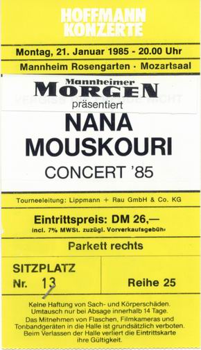 | 21.01.1985 | Mannheim | Rosengarten - Mozartsaal | D | Ticket | C | |||
