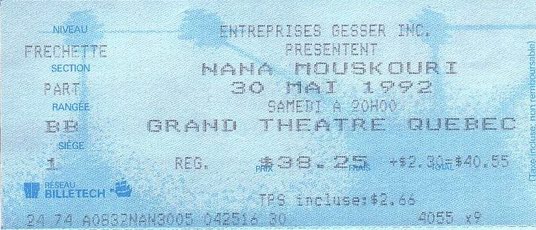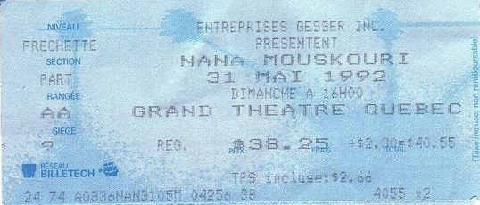 | 31.05.1992 | Quebec, QC | Grand Théâtre | CDN | Ticket | C | |||