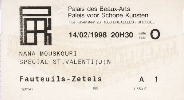 | 14.02.1998 | Bruxelles / Brüssel | Palais voor Schone Kunsten | B | Ticket | O | |||