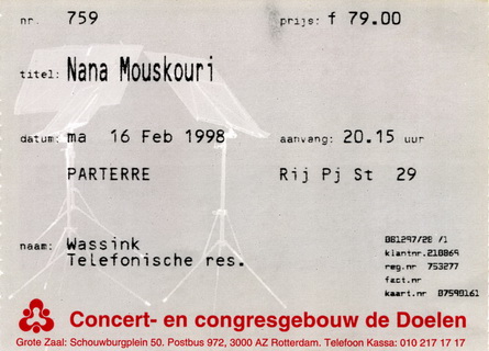 | 16.02.1998 | Rotterdam | de Doelen | NL | Ticket | O | |||