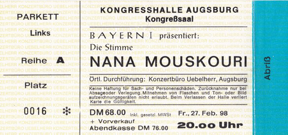 | 27.02.1998 | Augsburg | Kongresshalle | D | Ticket | O | |||