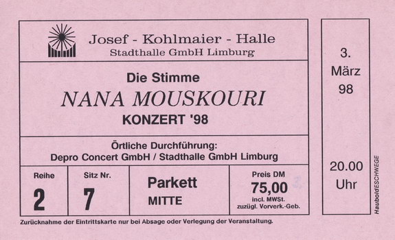 | 03.03.1998 | Limburg | Stadthalle | D | Ticket | O | |||