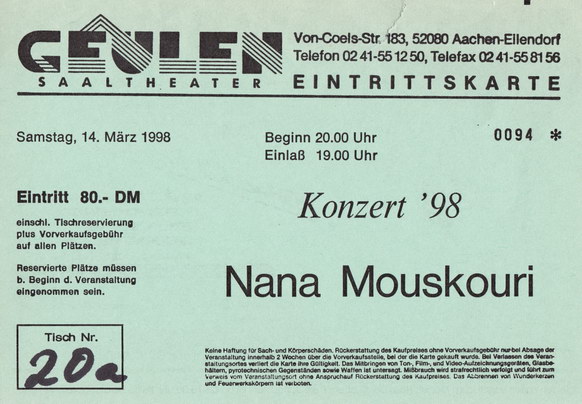 | 14.03.1998 | Aachen | Saaltheater Geulen | D | Ticket | O | |||
