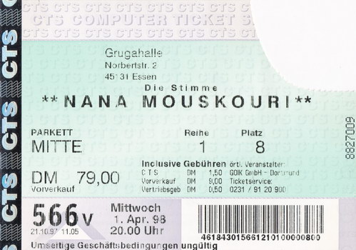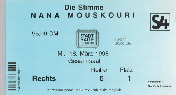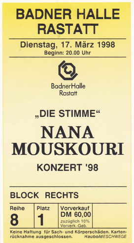 | 19.03.1998 | Mannheim | Mozartsaal | D | Ticket | O | |||
