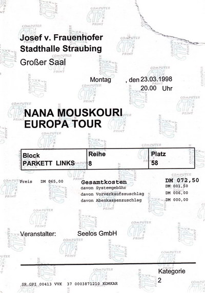 | 23.03.1998 | Straubing | Stadthalle | D | Ticket | O | |||