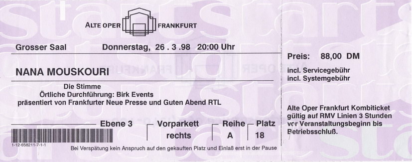 | 26.03.1998 | Frankfurt | Alte Oper | D | Ticket | O | |||
