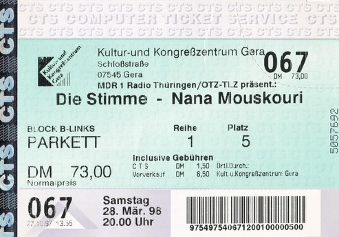 | 28.03.1998 | Gera | Kultur- und Kongresszentrum | D | Ticket | O | |||