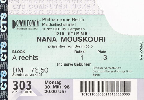 | 30.03.1998 | Berlin | Philharmonie | D | Ticket | O | |||