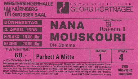 | 02.04.1998 | Nürnberg | Meistersingerhalle | D | Ticket | O | |||