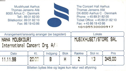| 11.11.1998 | Aarhus | Musikhuset | DK | Ticket | O | |||