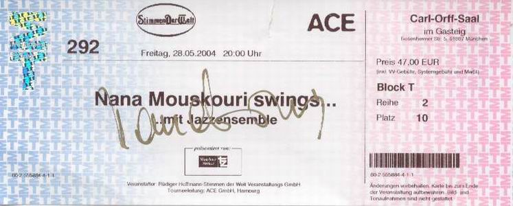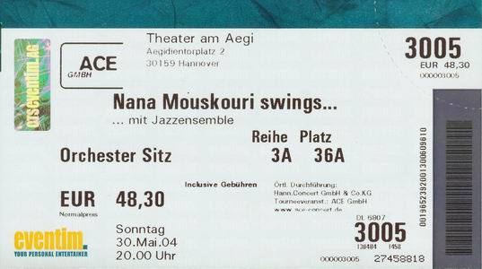 | 30.05.2004 | Hannover | Theater am Aegi (Jazzkonzert) | D | Ticket | O | |||