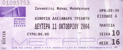 | 11.10.2004 | Athen | Athens Concert Hall (Megaro Mousikis) | GR | Ticket | O | |||