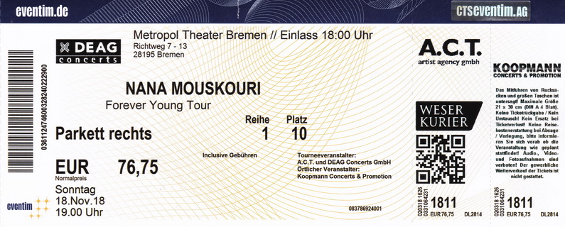 | 18.11.2018 | Bremen | Musical Theater | D | Ticket | O | |||